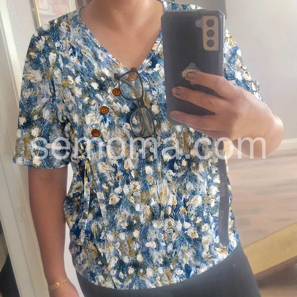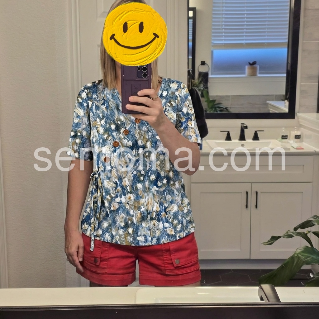 I love the diagonal button detail on this top! It adds such a unique touch to a standard floral shirt. The fit is very flattering and hides my mom tummy perfectly. The material is lightweight and breathable for summer. Highly recommend!