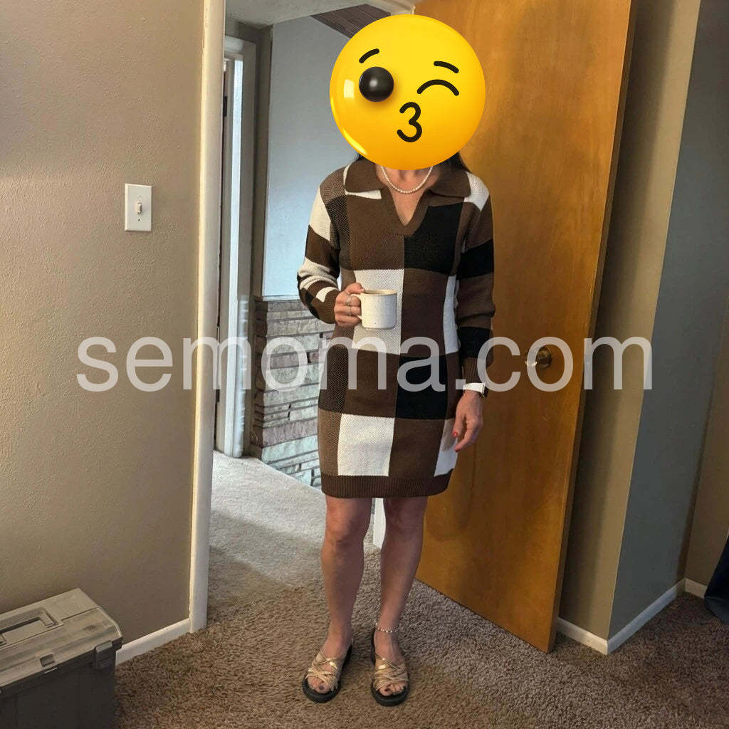 Brown V-Neck Long Sleeve Mini Dress