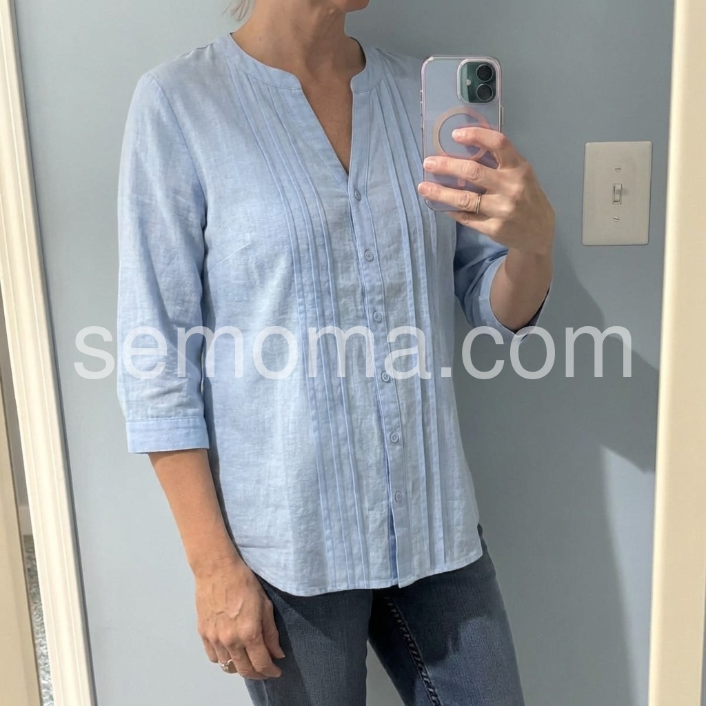 The round notched V-neck, vertical front pleats, and full button placket create a polished, structured silhouette, while the 3/4 cuffed sleeves offer versatile styling.