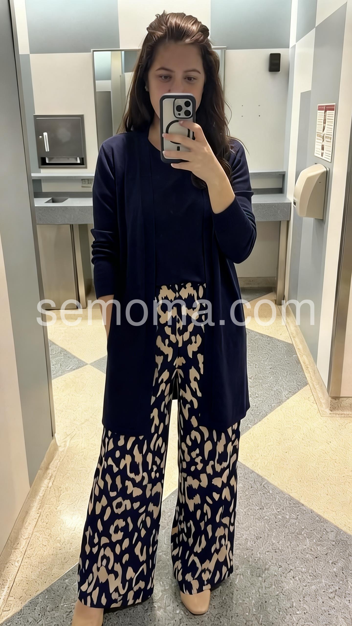 This coordinated outfit features wide-leg pants in a striking navy and cream leopard print. Paired with a matching long cardigan and solid top for a polished look. The relaxed fit offers comfort and style. Perfect for casual outings or stylish events. Effortlessly chic with a modern edge.