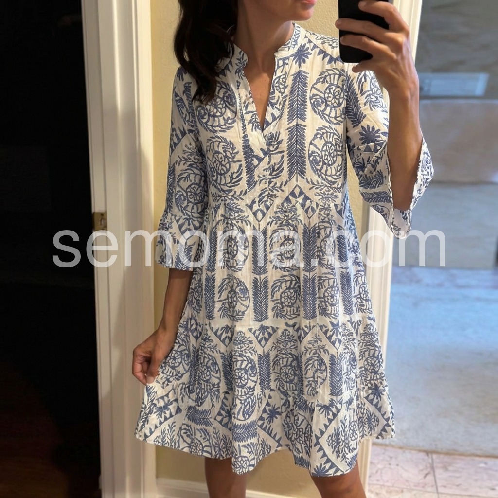 Blue V-Neck 3/4 Sleeve Mini Dress