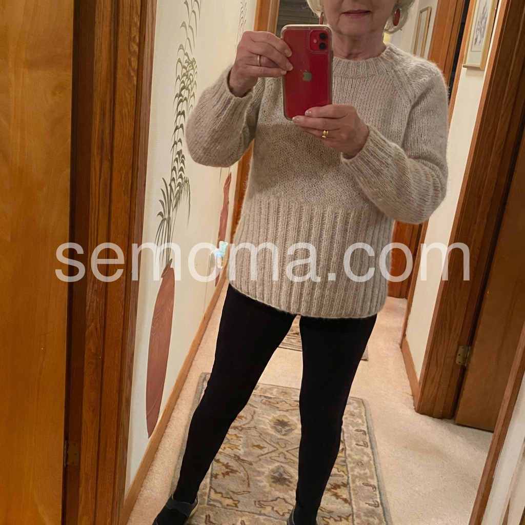 So cozy and warm! The material looks like a high-end alpaca or mohair blend. I was worried it might be itchy, but it is surprisingly soft against the skin. The raglan sleeves give it a nice casual drape.