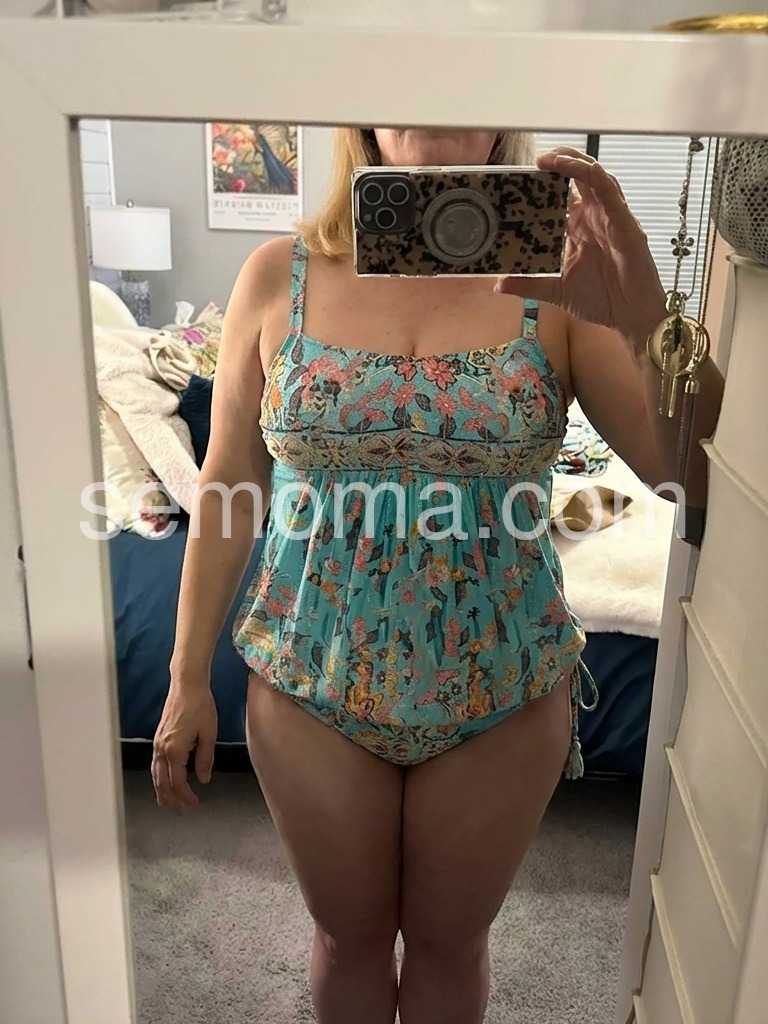 5'5 150lbs 70 year old Medium Bathing suit ... great material, hides stomach area well with style