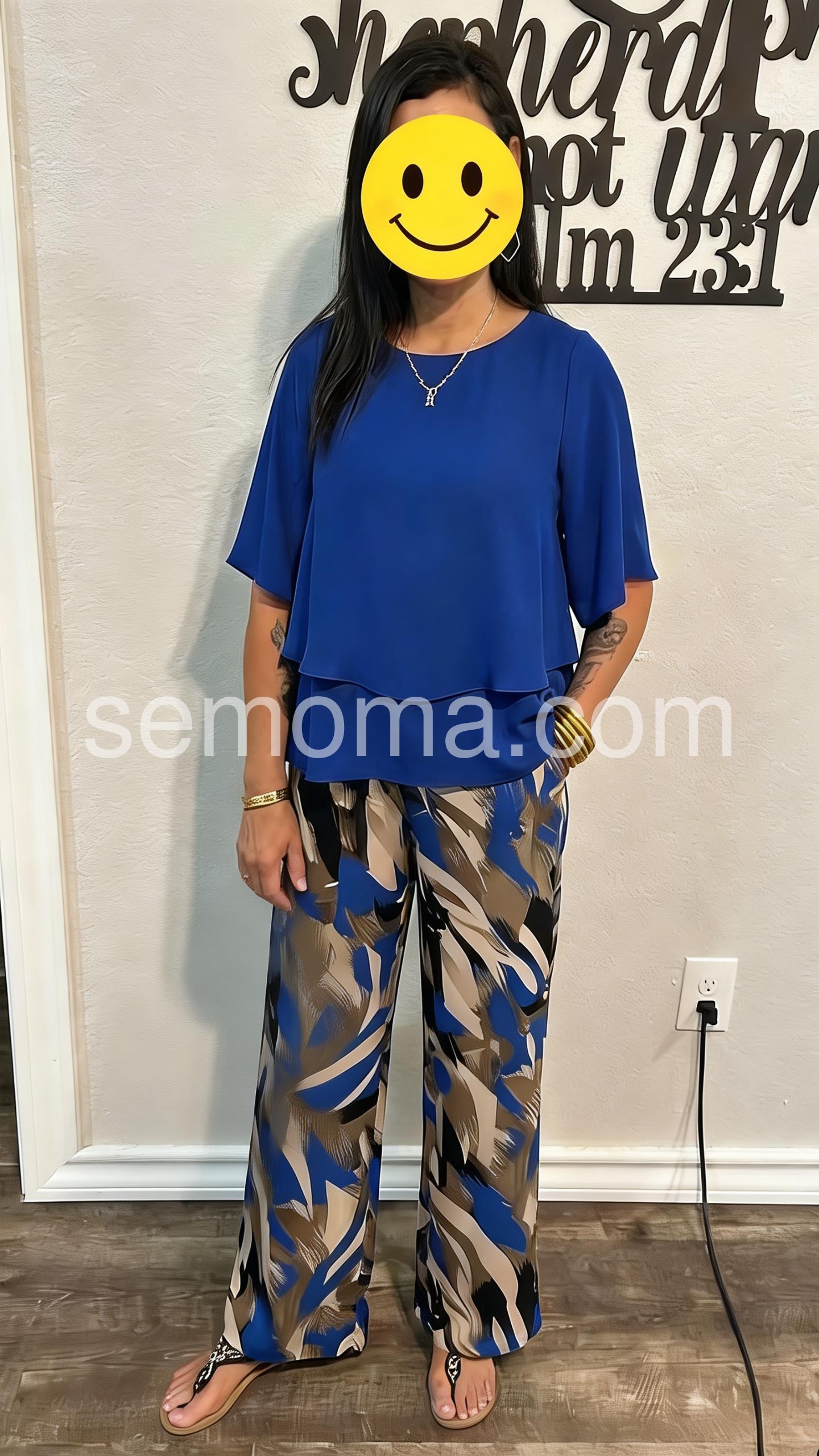 This coordinated outfit features a flowy royal blue top with a layered hem and wide-leg pants in a vibrant abstract print. The mix of solid and patterned pieces creates a modern, eye-catching look. Perfect for casual outings or warm-weather days. Comfortable, confident, and effortlessly chic.