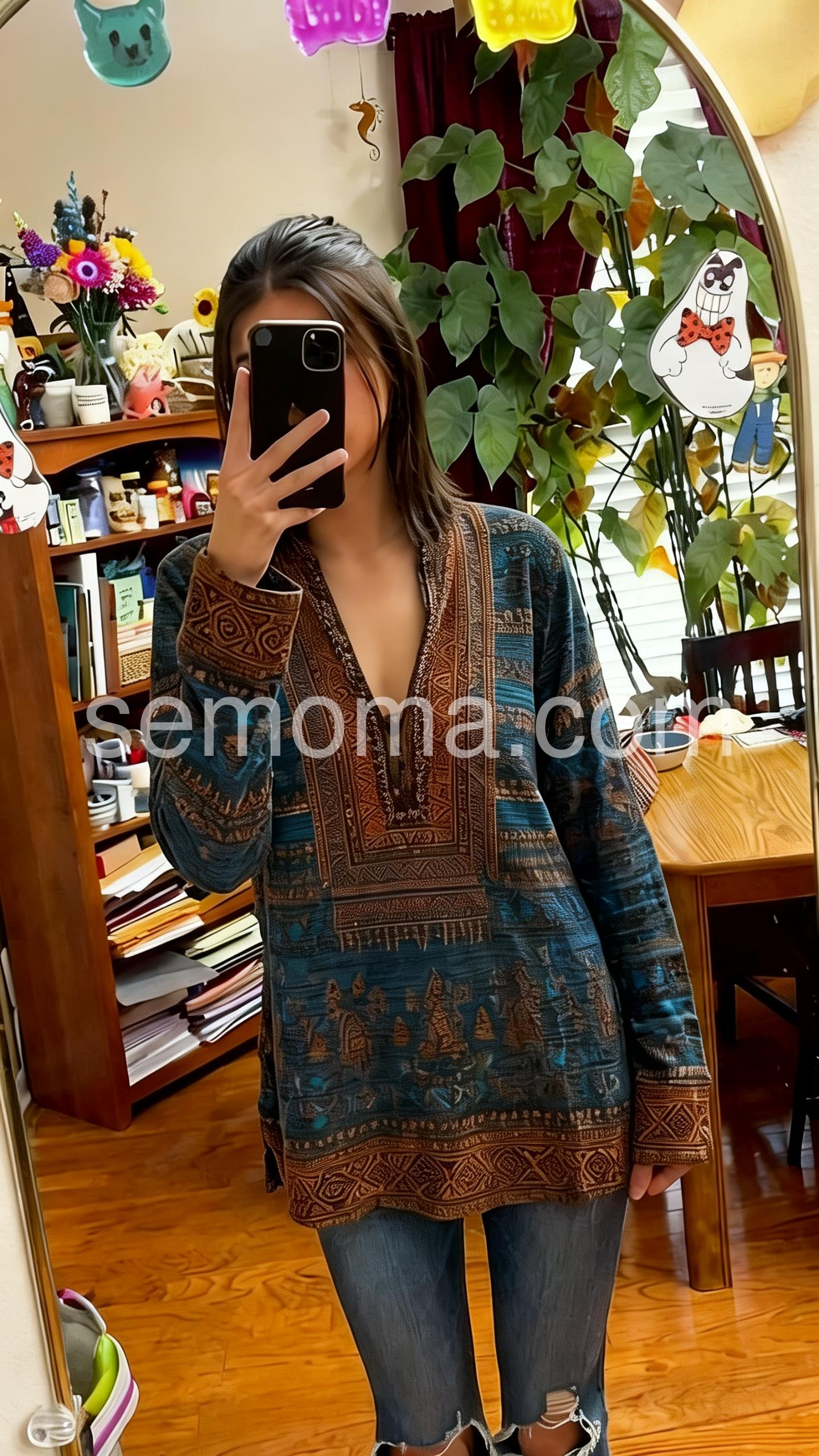 This is such a nice boho tunic. The fabric feels soft and the print is vibrant and well done. The V-neck design is flattering, and the fit is comfortable through the shoulders and sleeves. I wore it out and it looked great all day. Matches the listing pictures perfectly highly recommend!